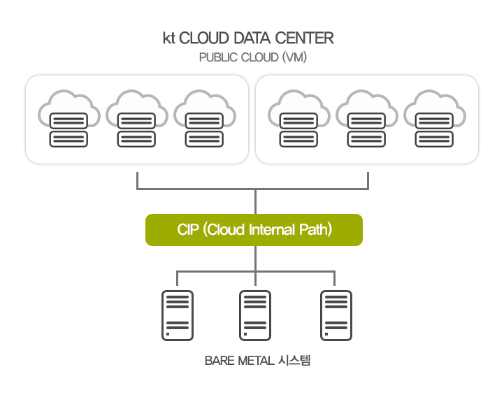 서비스망과 분리된 내부 네트워크(CIP)로 연결- 가상서버(VM)와 Baremtal 서버와 연동을 위하여는, 서비스망과 별도 CIP(Cloud Internal Path)로 10Gbps급 고속 네트워크를 구성합니다. 서비스망을 통한 인터넷 대역폭에는 영향없이 Hybrid Cloud 구성이 가능합니다.